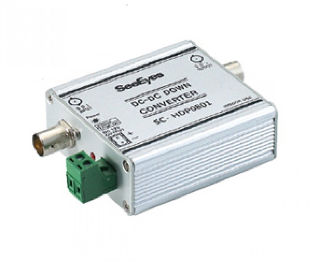 SDI signalo imtuvas su maitinimu. Įrenginys gauna 48VDC maitinimą iš SeeEyes HDS0801 siųstuvo ir konvertuoja į 12VDC kamerai maitinti.