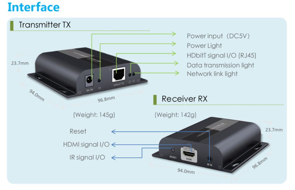 - Perduoda HDMI signalą per UTP CAT5e/CAT6 iki 100 m;
